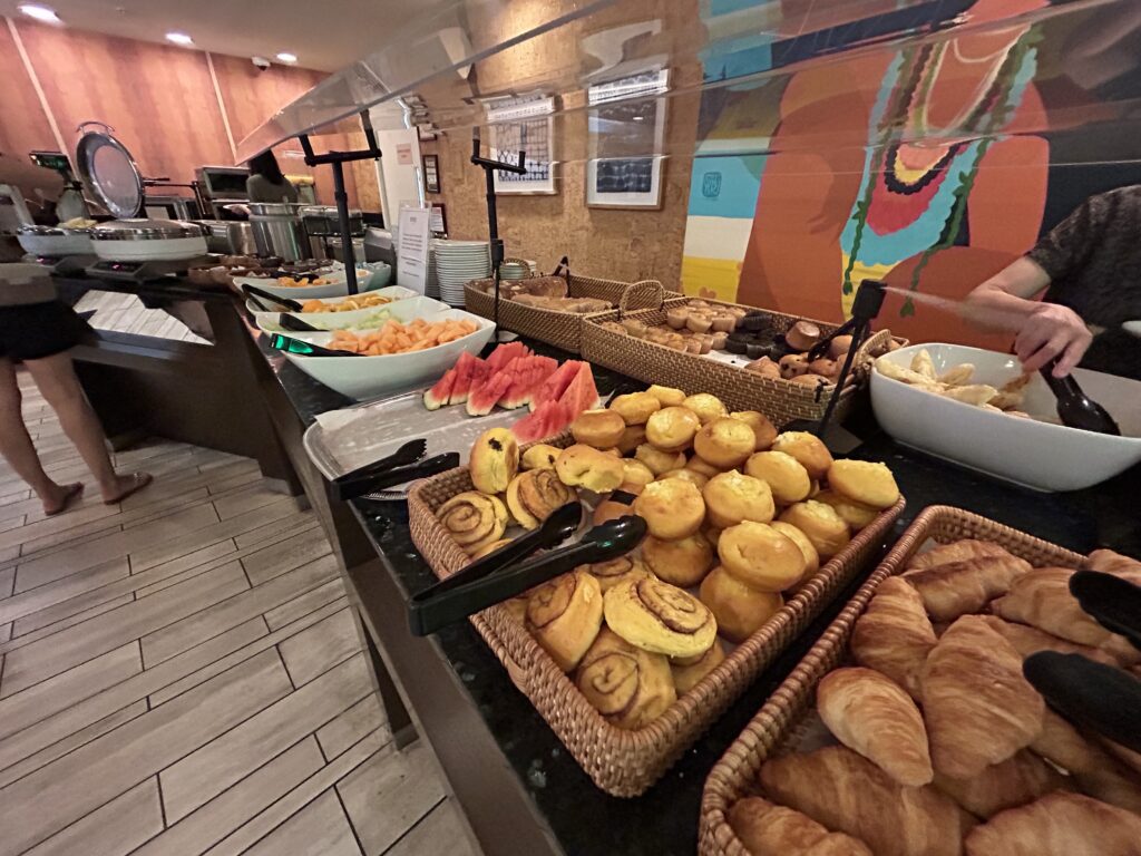 ありがたい朝食付きホテル。パンやフルーツ・オートミール、日替わりでゆで卵やベーコンが並んでいました。外で朝食を食べると軽く3000〜4000円ぐらいはするのでありがたい!!子どもにはスーパーでヨーグルトを買って部屋で追加で食べていました。